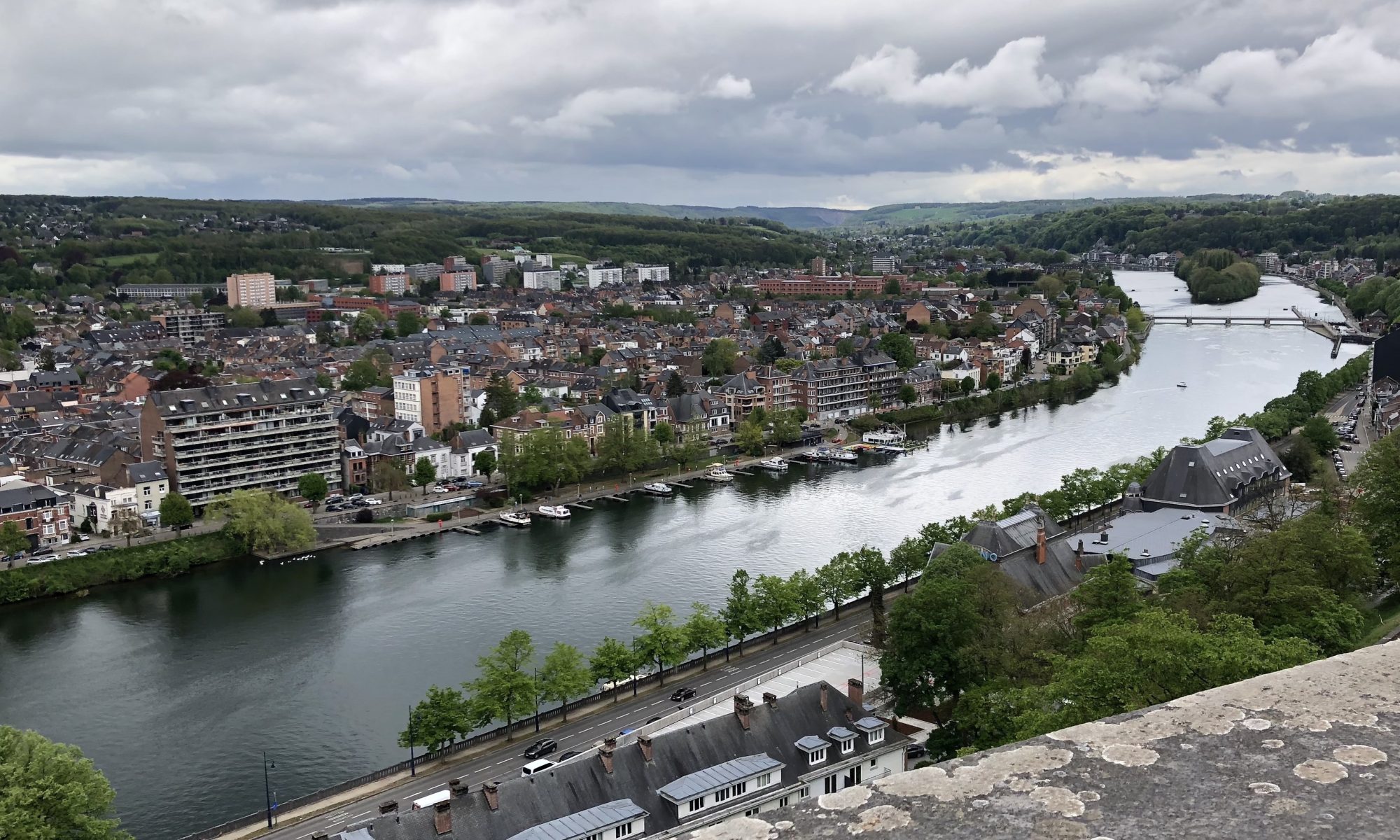 We’re in the commune of Namur, the capital of Wallonia (the French-speaking part of Belgium). It also happens to be a Twin City with Lafayette, LA. Built at the confluence of the Meuse and Sambre Rivers, the city has a rich and varied history, culminating in the Citadelle that overlooks the city, the two rivers, and our neighborhood.